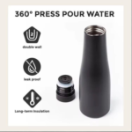 La SlimThermo 600 est la gourde isotherme en acier inoxydable de 600 ml qui s’impose comme un goodie de prestige pour un impact maximal. Son design épuré, sa finition noir mat et sa forme longiligne la rendent particulièrement élégante et tendance. Grâce à sa double paroi et son isolation longue durée (Long-term Insulation), elle conserve parfaitement la température des boissons chaudes ou froides, ce qui en fait un compagnon quotidien indispensable. L’étanchéité absolue (leak proof) et son système d’ouverture/fermeture par pression à 360° (360° press pour water) sont des atouts majeurs de fonctionnalité. En choisissant cette gourde personnalisable, vous offrez un cadeau d’entreprise de haute qualité qui véhicule une image de marque moderne et durable. Elle est idéale pour les événements sportifs, les cadeaux de fin d’année ou les kits de bienvenue. Optez pour ce goodie écologique et haut de gamme pour un excellent référencement (SEO gourde inox) et une satisfaction client garantie.