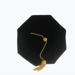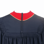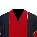 - Un superbe panneau de velours de 4 pouces de large s’étend des épaules jusqu’au cou et se prolonge sur le devant de la robe de doctorat.