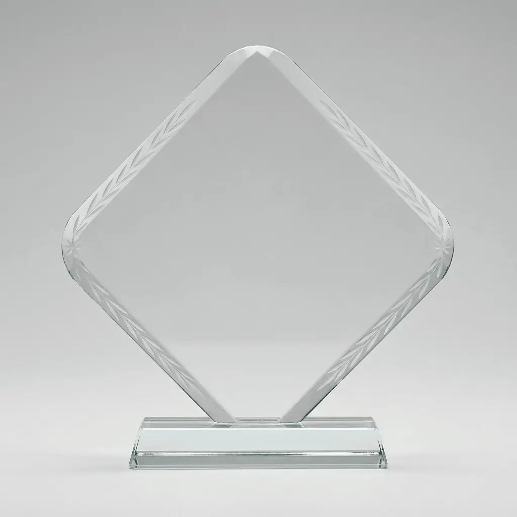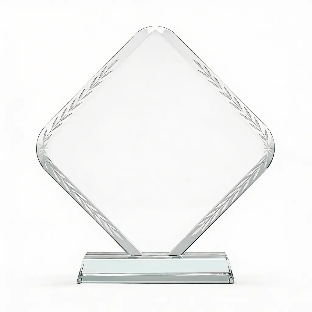 Ce trophée en verre biseauté est une pièce maîtresse pour célébrer les réussites exceptionnelles. Sa structure en forme de diamant (losange) apporte une dynamique visuelle forte, tandis que les détails de gravure sur les arêtes ajoutent une touche d’élégance classique.